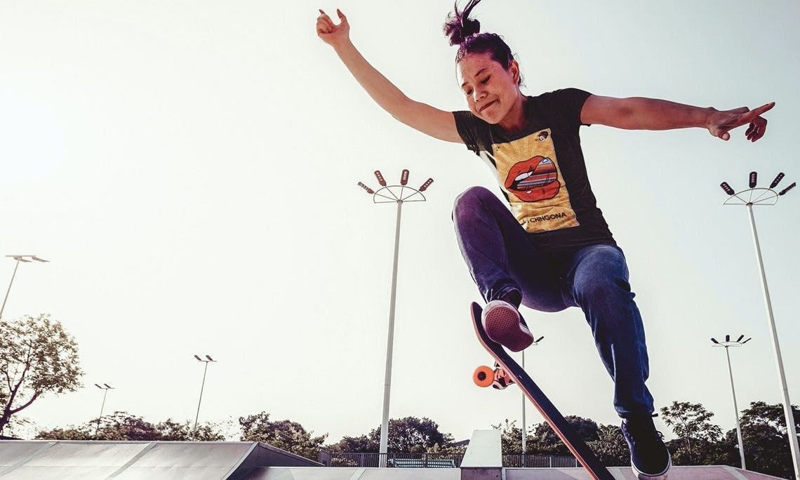 Girl skateboarding wearing a House of Chingasos t-shirt