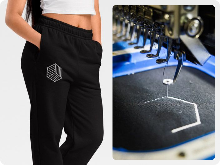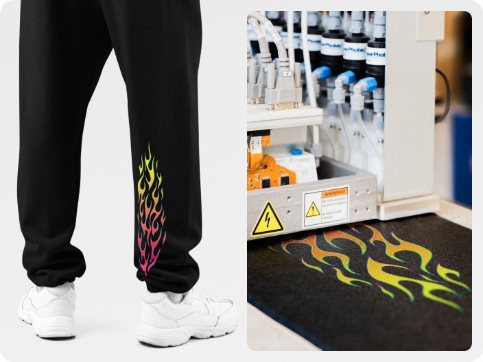 Direct-to-garment (DTG) printing sprays water-based ink directly onto fabric for rich detail and vibrant colors. It’s ideal for intricate, multicolor custom sweatpants designs.