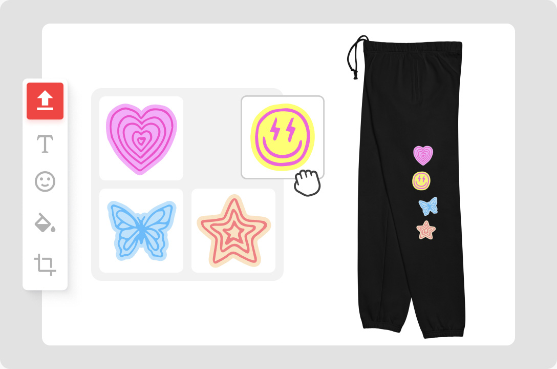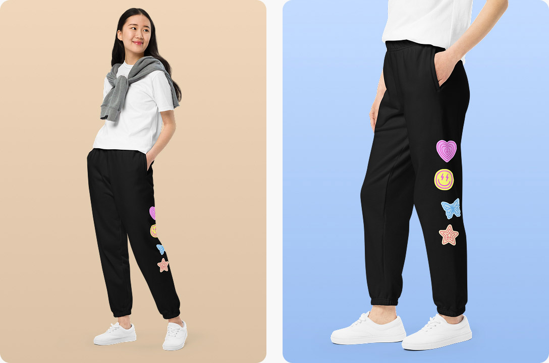 You can upload your own design or use Printful’s Design Maker to create one. The free tool includes easy-to-use features and ready-made assets, so you can design custom sweatpants without technical skills or prior experience.