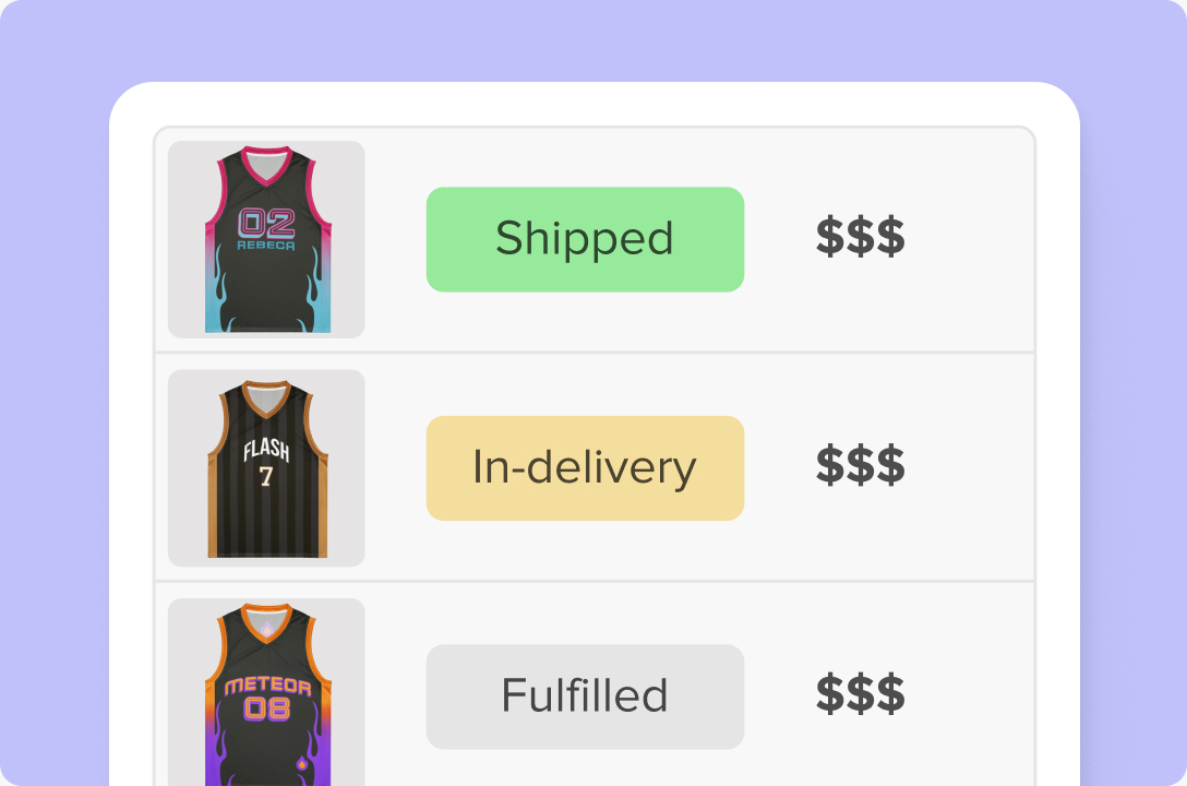 Just design a jersey and publish it to your online store. Once you get an order, we’ll automatically receive the info and get right to work printing and shipping it to your customer. We have fulfillment centers worldwide to ensure speedy delivery.