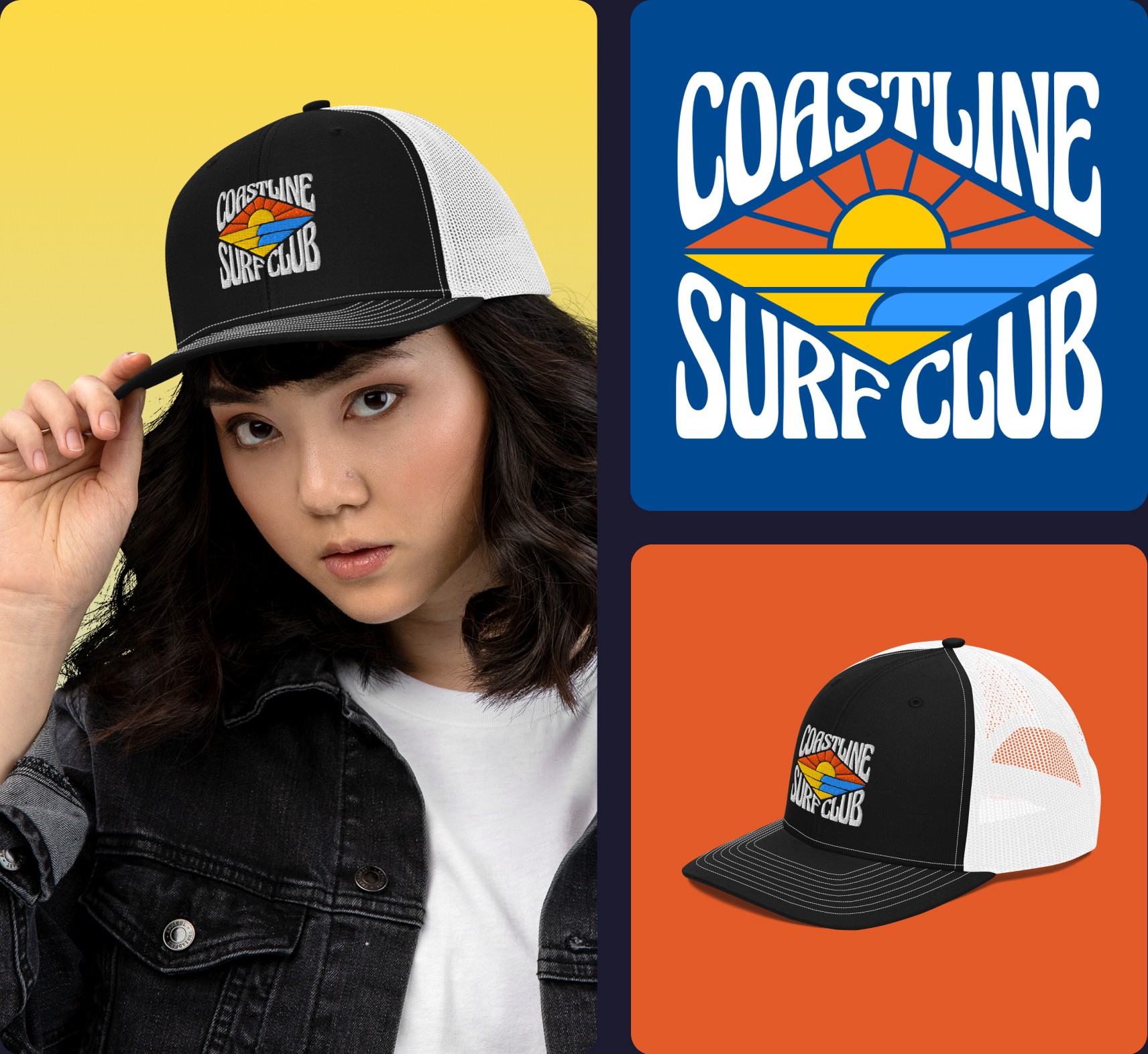 Model wearing a black and white Coastline Surf Club trucker cap with embroidered sunset and wave logo, alongside product-only cap image on colorful backgrounds.