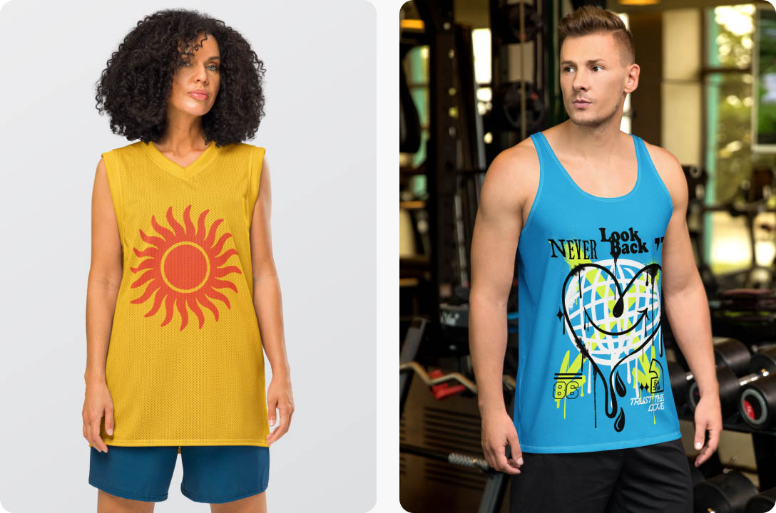 - All-over print (AOP) tank tops: Your design is printed onto a sheet of fabric, which is then cut and sewn into a tank top.