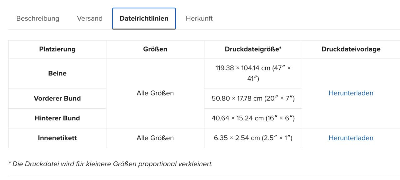 Hinweis: Diese Tabelle dient als Übersicht. Aktuelle Informationen findest du in der jeweiligen Produktbeschreibung im Printful-Katalog.