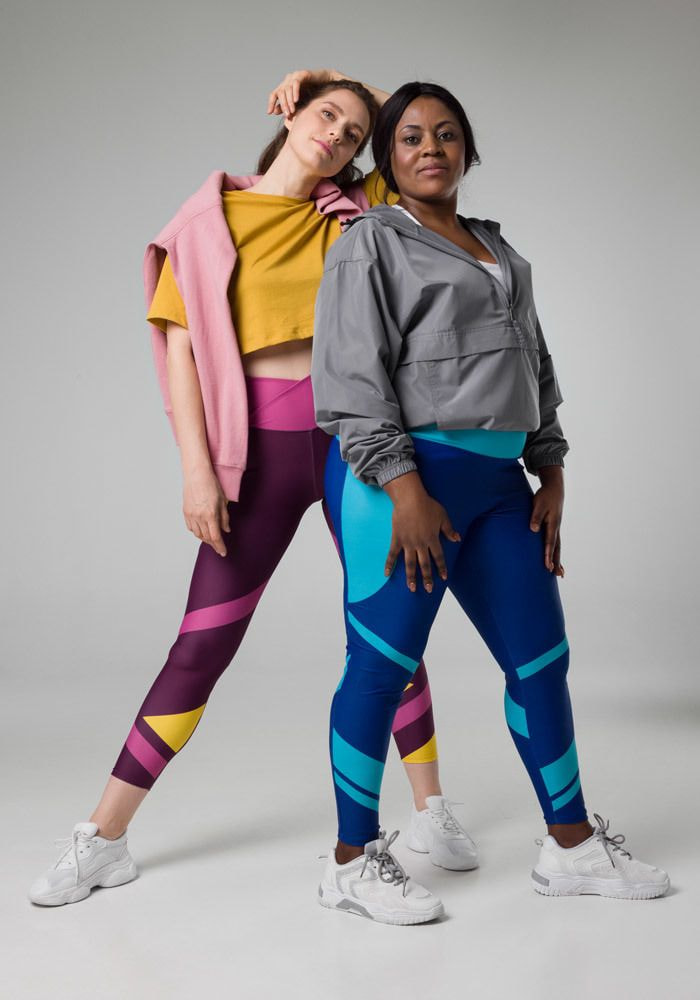 Color-Blocking ist seit Langem ein fester Bestandteil der Mode. Es ist eine zeitlose Designwahl, sowohl in der Freizeit- als auch in der Sportmode. Designs im Color-Blocking-Stil sind einfach zu erstellen und eine sichere Wahl, wenn du Leggings selbst gestalten möchtest. Wähle Farben, die in dieser Saison im Trend liegen, und kreiere auffällige Designs.