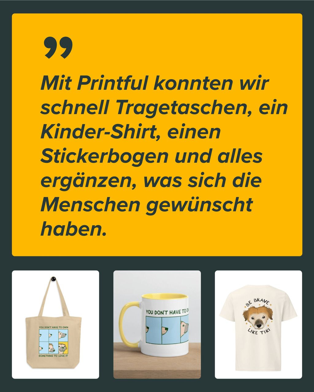 Während Printful die Abwicklung, den Kundenservice und die Versandlogistik übernahm, konnte sich Mallory auf das konzentrieren, was wirklich zählt: Geschichten erzählen, Hunde retten und ihre Community weiter ausbauen.