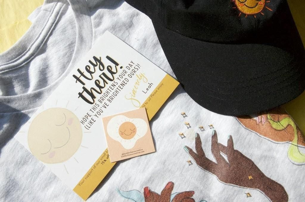 Deine Visitenkarte und Postkarte enthalten denselben sonnigen Gelbton und passen zu der auf die Cap gestickten Sonne. Anhand dieses Schnappschusses bekommen die Kunden sofort eine Vorstellung von deiner Marke und deinem Illustrationsstil!