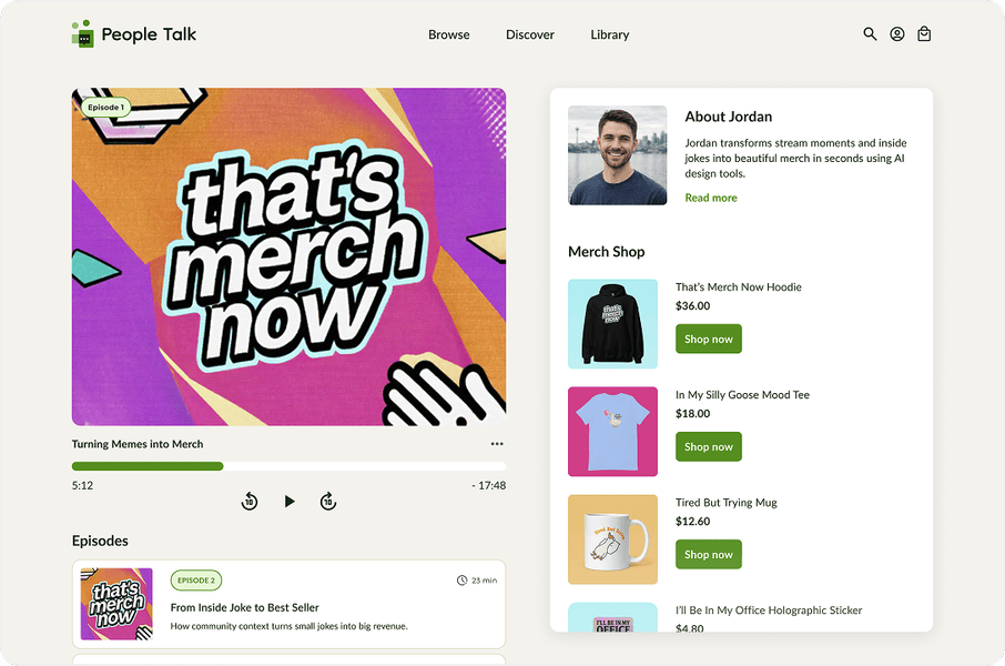 Give your customers a new way to create, publish, and sell merchandise natively on your platform.