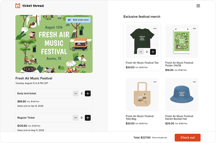 • Organizers can list merch at ticket purchase, during event build up and day-of, with on-demand production and delivery meaning no costly inventory