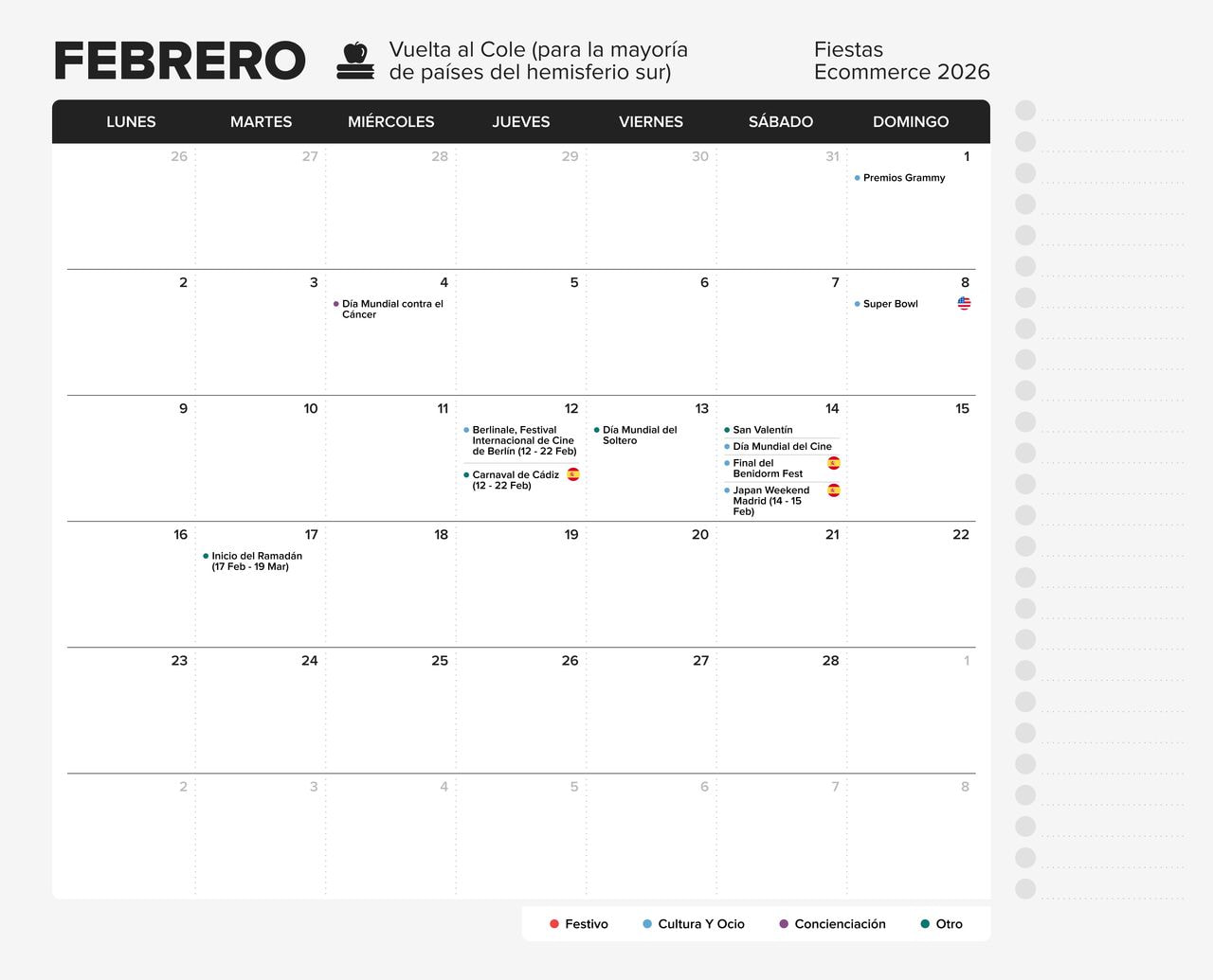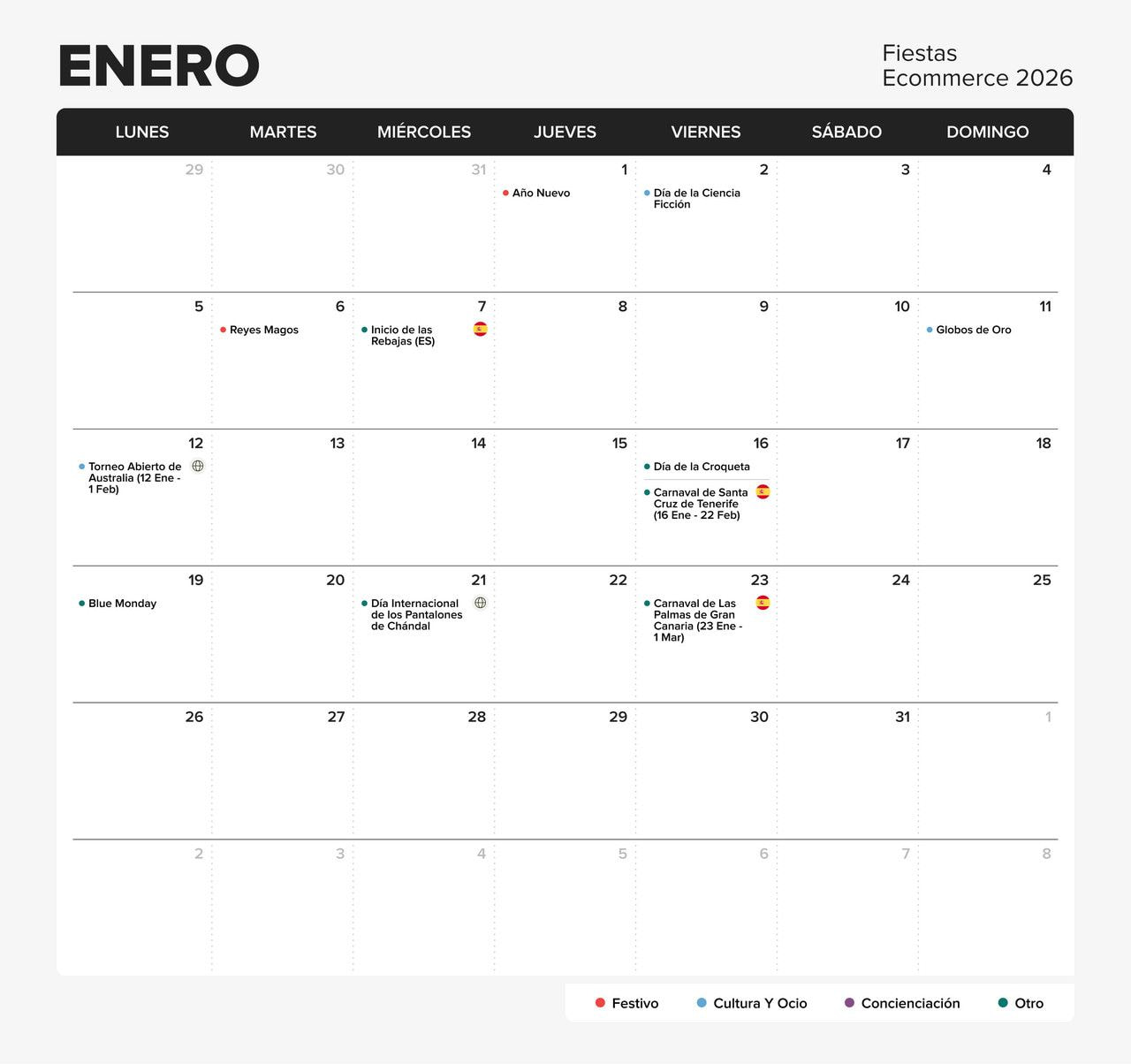 Para ahorrarte tiempo, hemos elaborado un calendario de marketing para 2026 con las fechas más destacadas en el mundo del ecommerce. Podrás descargarlo al final de este artículo e imprimirlo o añadir las fechas más significativas a tu Google Calendar para poder editarlo a tu gusto.