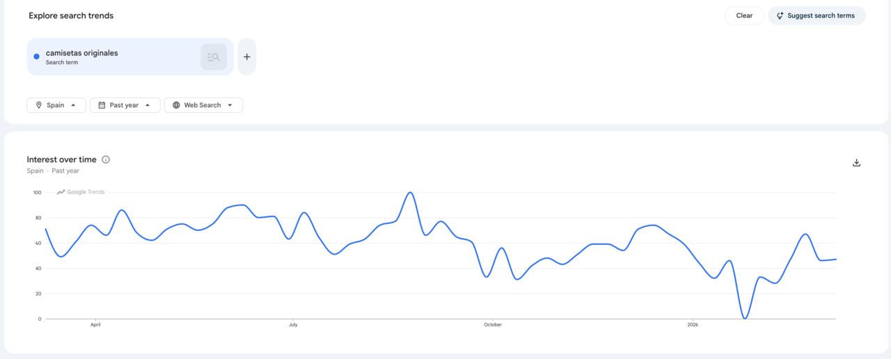 Por ejemplo, si buscas “camisetas originales” en Google Trends, verás que la demanda se mantiene bastante estable durante todo el año, pero presenta ligeros picos en verano y alrededor de Navidad. Esto indica que deberías concentrar tus esfuerzos de marketing en esas fechas.
