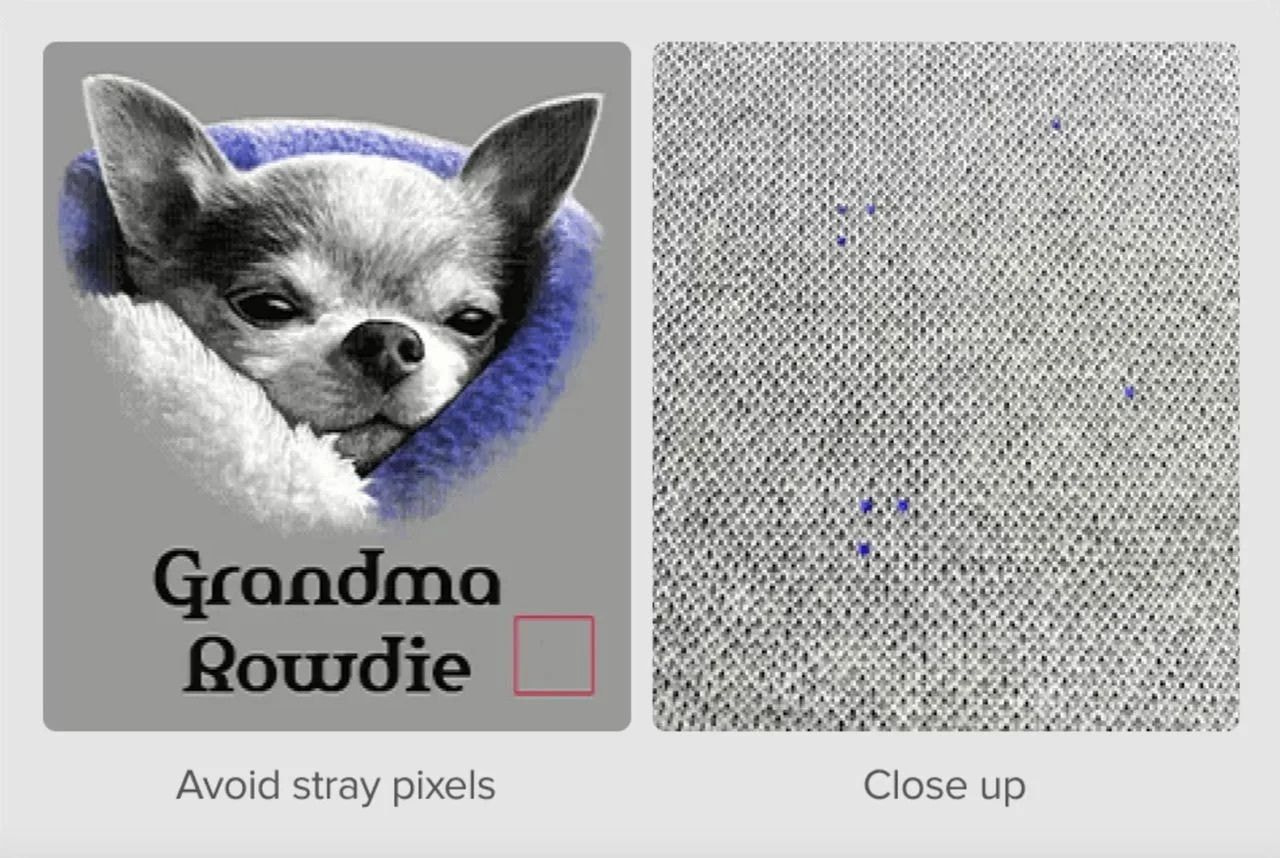 Il arrive parfois qu’un pixel errant soit laissé par erreur sur la toile. Si vous ne le remarquez pas, il sera intégré au tissu comme le reste de votre motif et pourrait finir par ressembler à une tache. Vérifiez donc soigneusement votre illustration avant de la télécharger afin de détecter toute petite erreur.