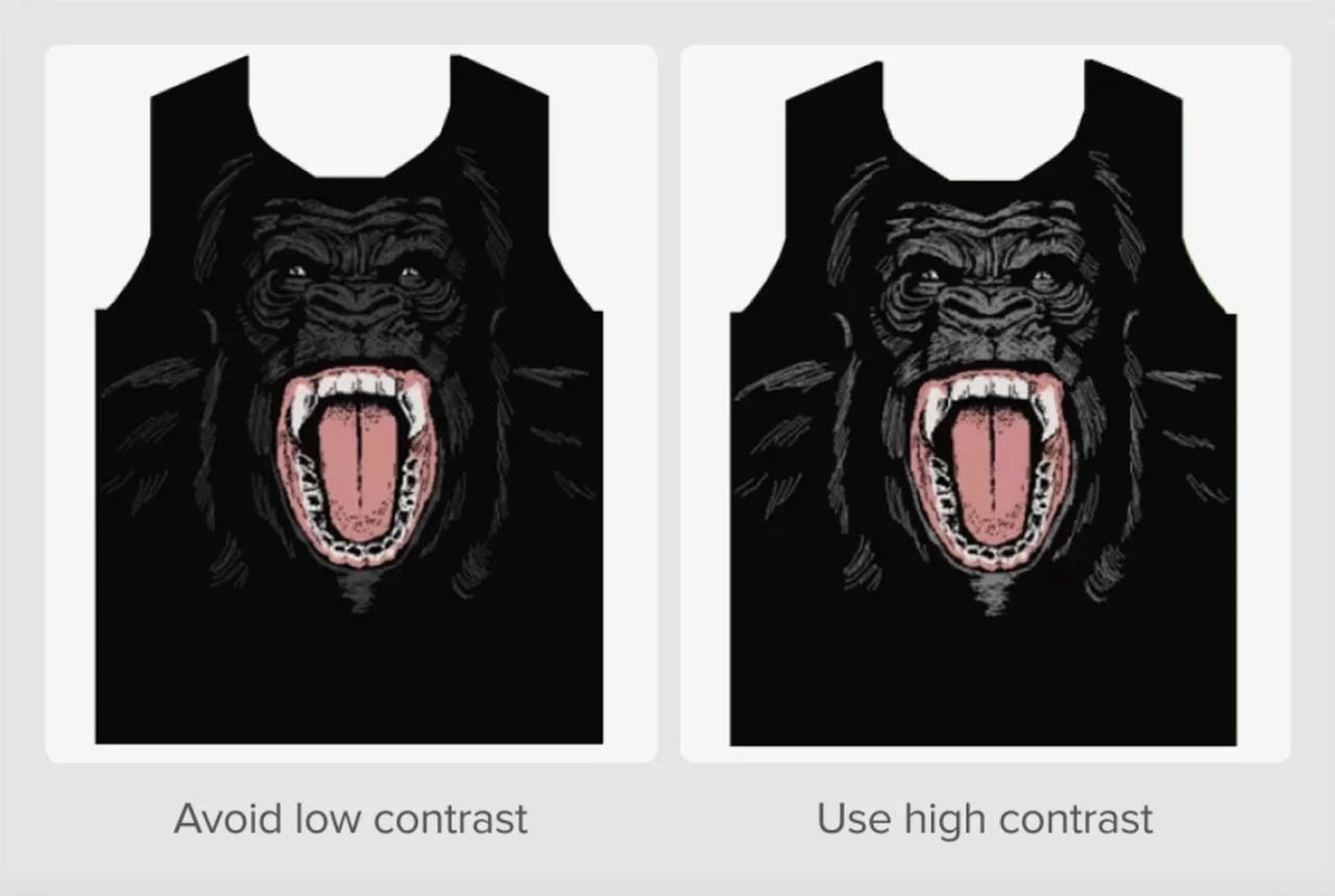 Les couleurs qui semblent distinctes sur votre écran peuvent se confondre sur le vêtement final. Évitez d’utiliser des couleurs à faible contraste côte à côte afin de garantir la clarté de votre design.