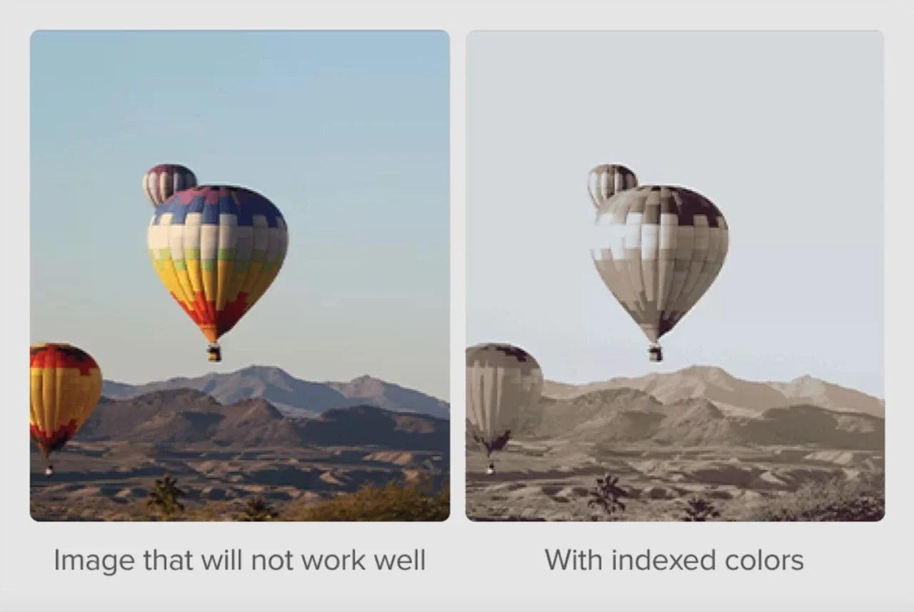 Gardez à l’esprit que vous ne devez jamais redimensionner une image indexée, car la qualité pourrait se dégrader en raison des limitations de la palette de couleurs indexées. Assurez-vous que la taille de l'image est correcte avant l’indexation.