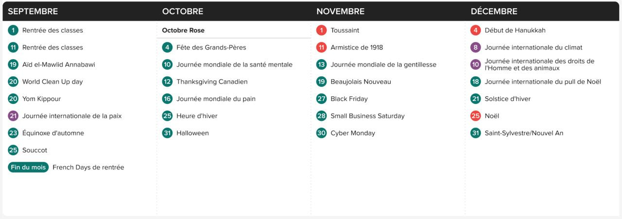 Mais il ne suffit pas de se concentrer sur le Black Friday et Noël, prévoyez des campagnes d’email marketing pour tous les événements les plus importants du 4e trimestre de l’année.