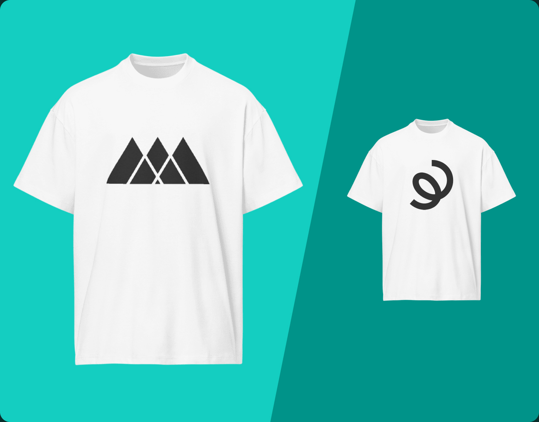 Two white t-shirts with simple black graphic logos displayed on teal background.