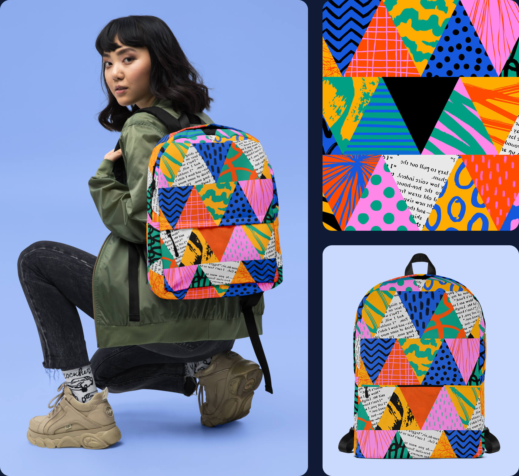 A woman kneels with a colorful, abstract-patterned backpack. Two close-ups show the backpack’s bold, geometric, and text-filled design on a blue background.